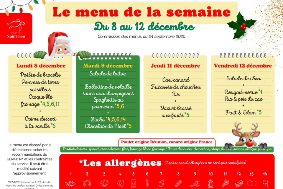 Lundi 8 : poêlée de brocolis, pommes de terre, croque blé fromage & crème dessert vanille 🥦Mardi 9 : ballotine de volailles sauce champignons, spaghettis au parmesan, bûche & chocolats de Noël 🍫Jeudi 11 : cari canard, chouchou, riz &