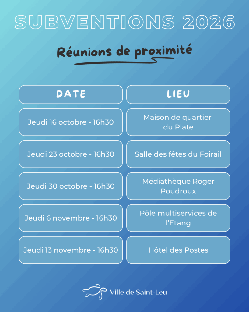 La Ville de Saint-Leu lance officiellement sa campagne de subvention municipale 2026 et privilégie la proximité avec ses acteurs locaux. Pour accompagner au mieux les associations saint-leusiennes dans la préparation de leurs dossiers de demande de subventions pour l’année 2026, des réunions de proximité sont organisées dans différents quartiers de la commune.