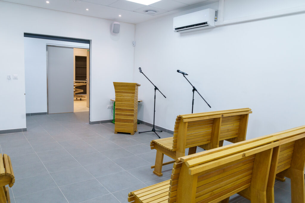 Autrefois salle funéraire, cet espace a été repensé pour devenir une chambre funéraire conforme à la réglementation en vigueur. Il comprend désormais :
