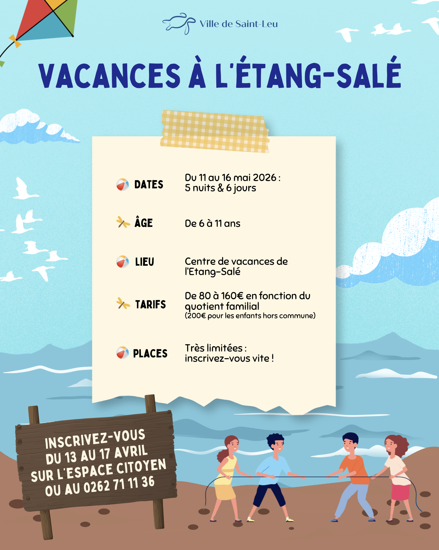 Le centre de vacances de l’Étang-Salé accueillera les enfants âgés de 6 à 11 ans pour une durée de 6 jours et 5 nuits, du 11 au 16 mai 2026.
