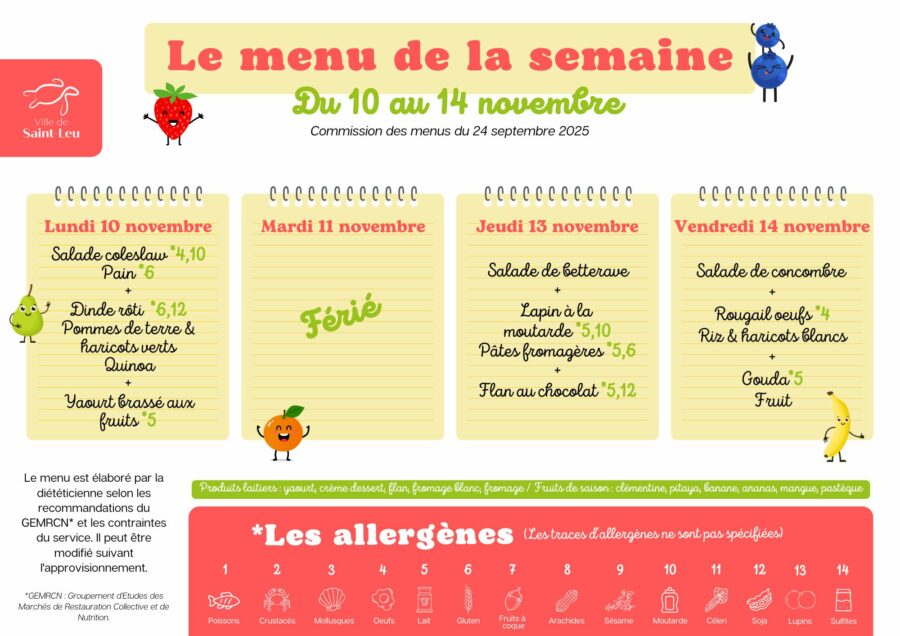 • Restauration scolaire : menu du 10 au 14 novembre 2025